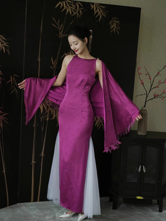 Traditional Chinese wedding dress. Off-the-shoulder modern cheongsam.