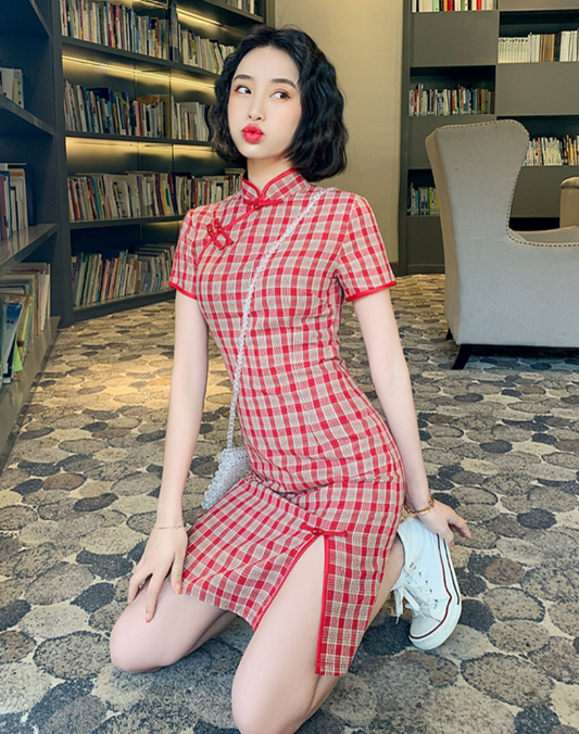 Cute Plaid Short Cheongsam - Cotton
