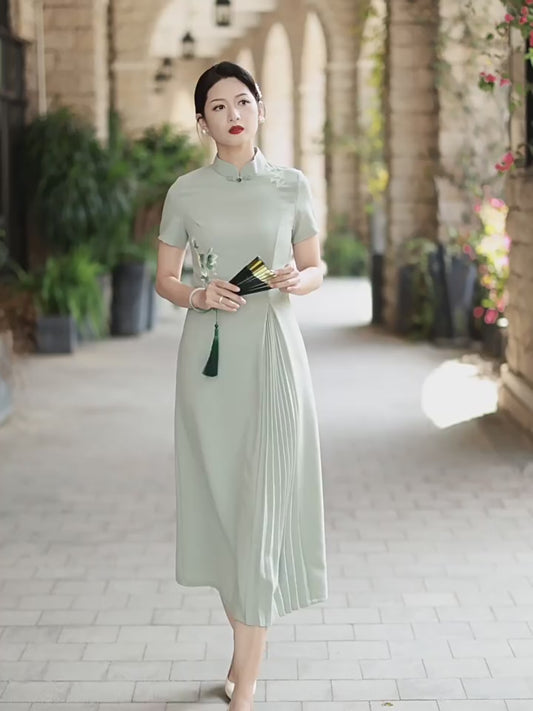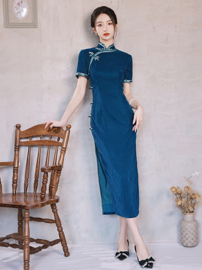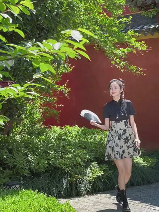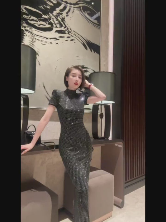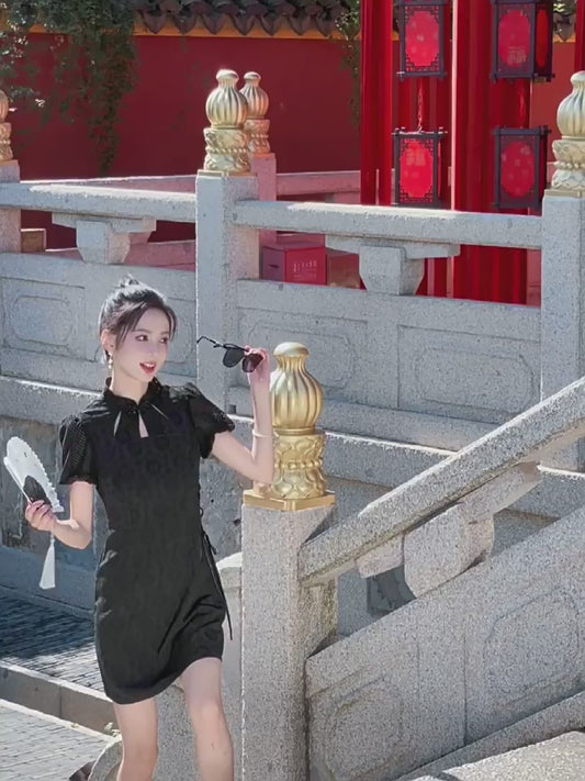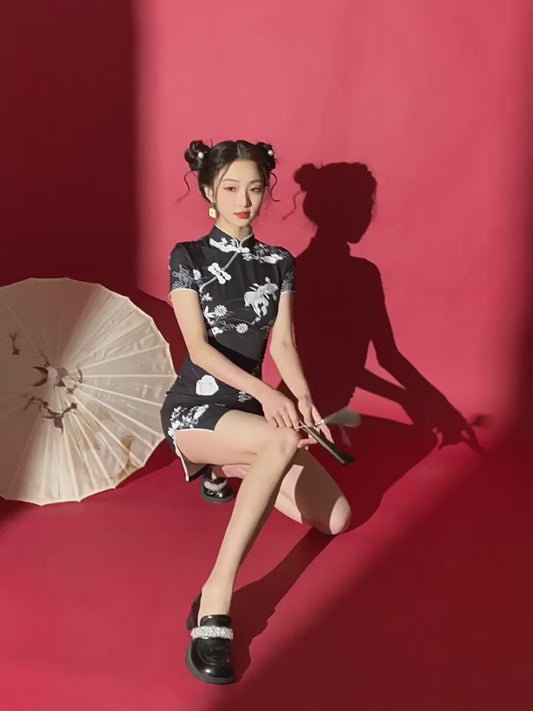 Black cheongsam. Short sleeve cheongsam. Black skirt.