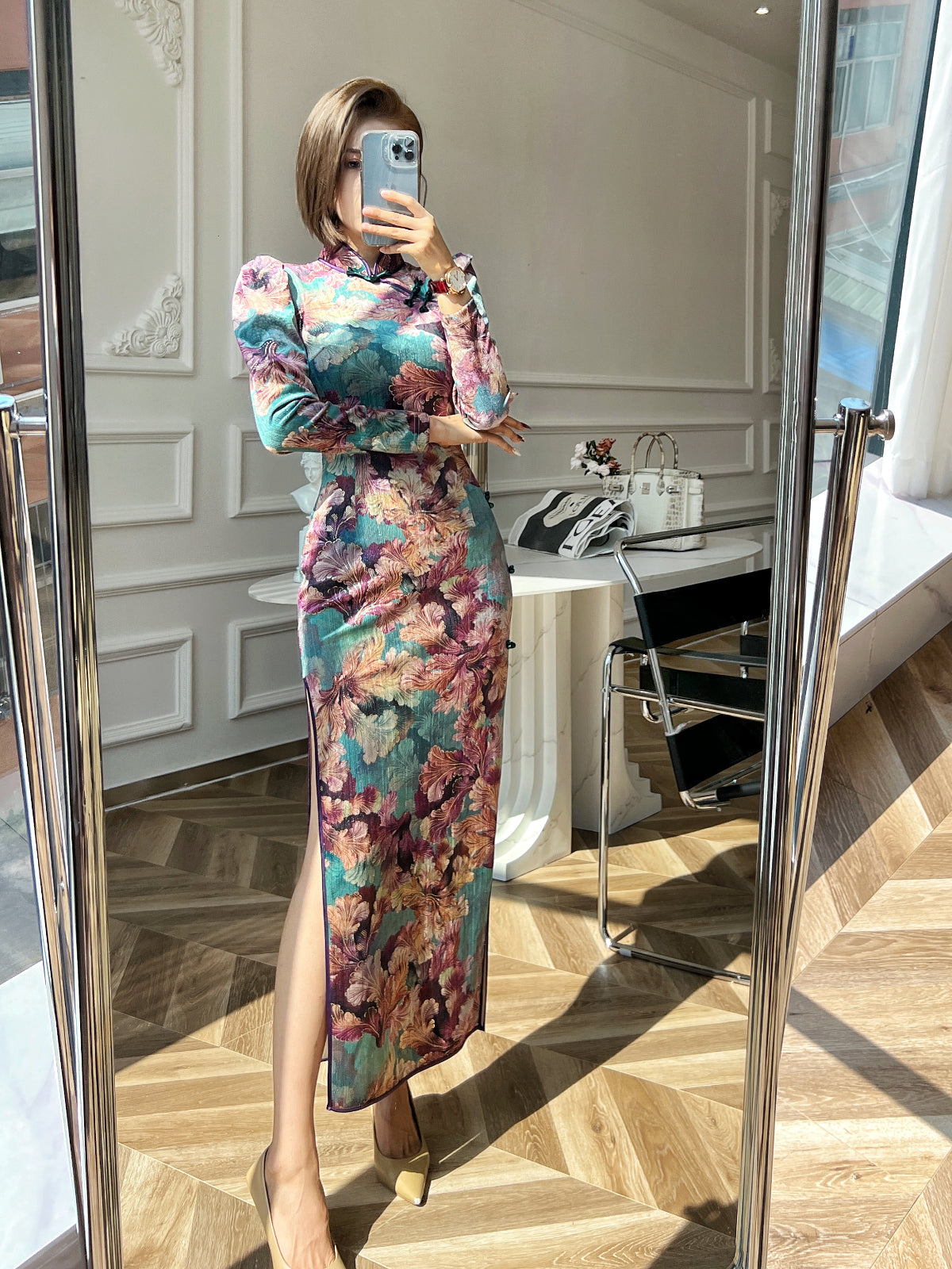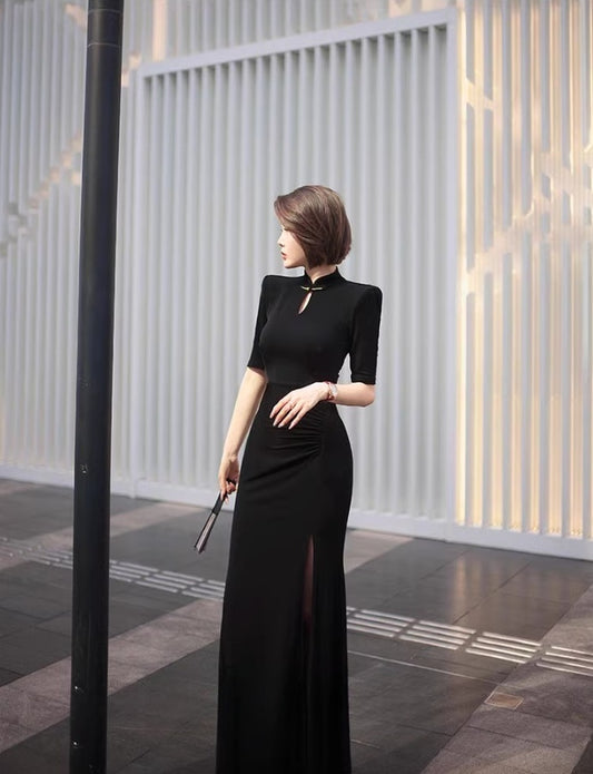 Black cheongsam. Chinese style long skirt. Chinese dress.