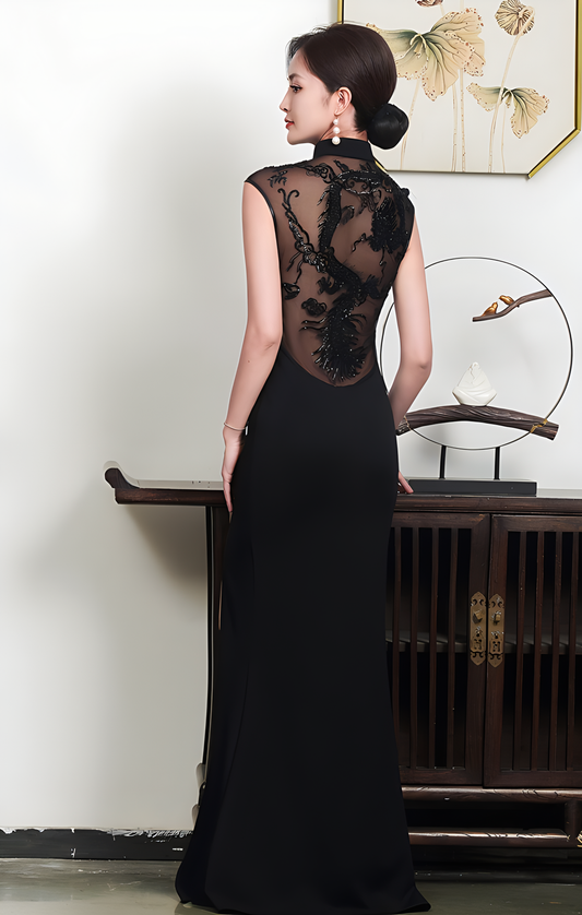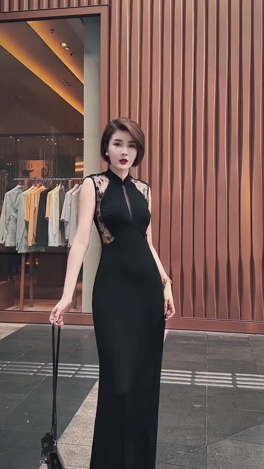 Black cheongsam dress. Lace dress. Sleeveless evening gown.