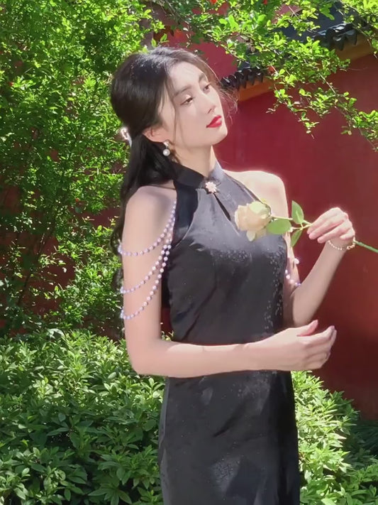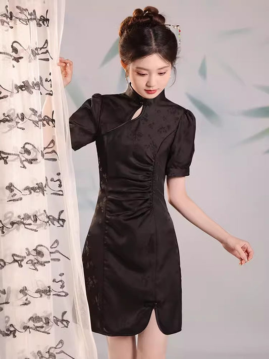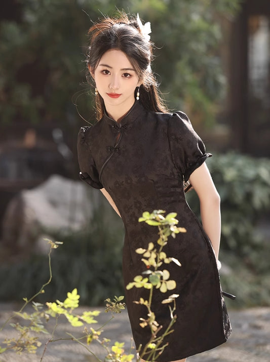 Black cheongsam. Chinese cheongsam dress. Short cheongsam. Black skirt.