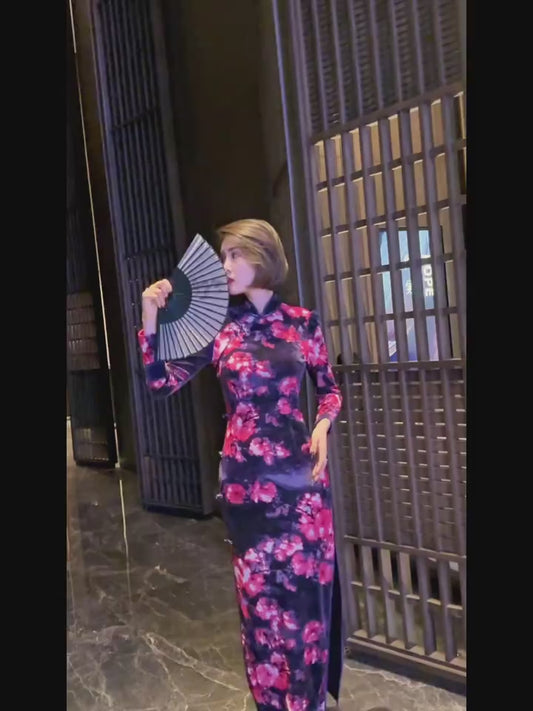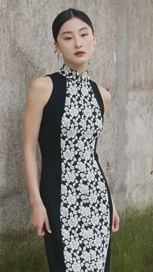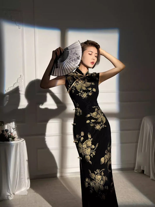 Elegant black floral cheongsam. Sleeveless dress. Customized cheongsam Qipao.