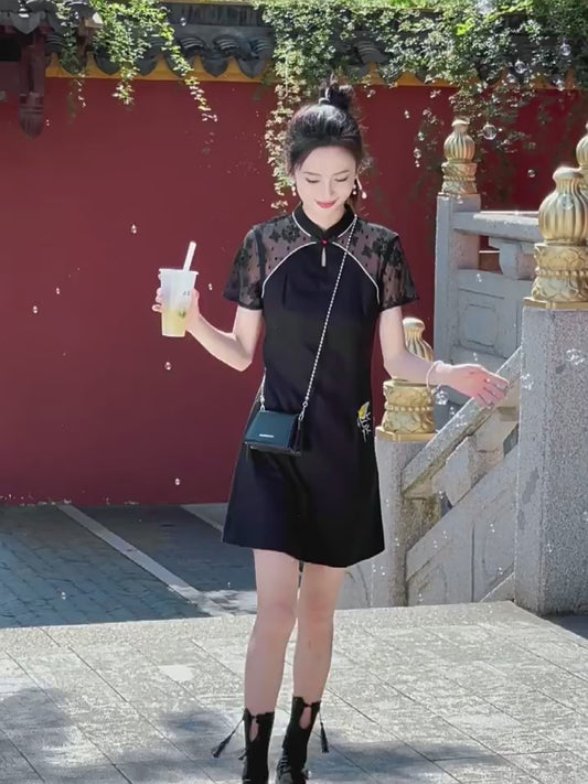 Black lace cheongsam. Short sleeve cheongsam. Black skirt. for you.