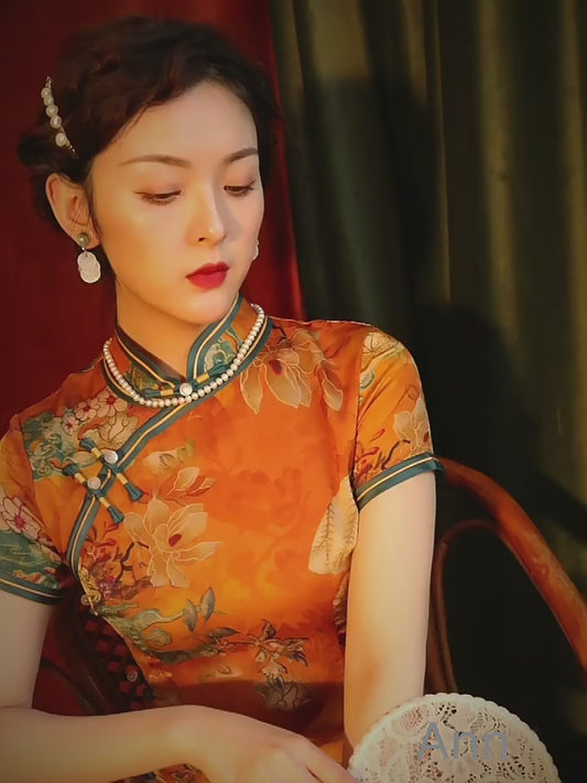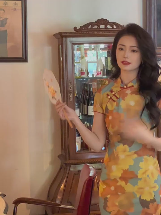 Yellow cheongsam. Floral short-sleeved cheongsam.