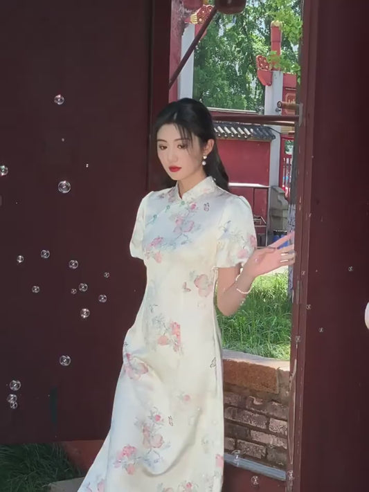 Champagne floral cheongsam. Short sleeve cheongsam. for you.